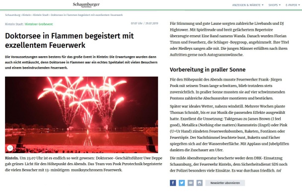 Aufgrund des weiträumigen Geländes, galt es für uns eine besondere Aufgabe zu lösen. Für das Musikfeuerwerk haben wir zwei Strandufer, mit einer Gesamtbreite von 850 Metern, mit Tontechnik bestückt. Das Feuerwerk befand sich auf zahlreichen Pontons auf dem Wasser, von denen aus in knapp einer Viertelstunde insgesamt rund 1,2 Tonnen Pyrotechnik synchron zur Musik abgeschossen wurden und etwa 30.000 Gäste begeisterten. Weitere Show-Acts, Bands auf Bühnen sowie Strandbars und ein großes Partyzelt rundeten den Abend fantastisch mit einer großen Party ab. Ein "Spektakel der Superlative" nennt es u.a. die MK: