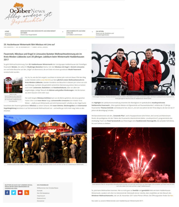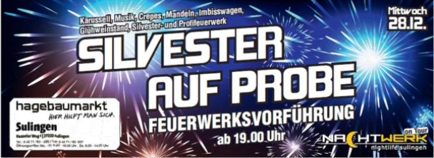 Wie auch in den vergangenen Jahren veranstalteten wir wieder zusammen mit den regionalen Hagebaumärkten eine Produktvorführung der Silvesterfeuerwerksartikel, die es an den letzten drei Werktagen im Dezember für Endverbraucher zu kaufen gibt. Wir stellen dabei jedes Mal Trends und Besonderheiten vor und krönen das Ganze anschließend mit einem choreographierten Abschlussfeuerwerk!