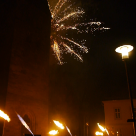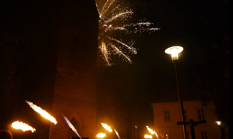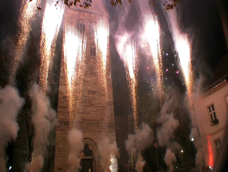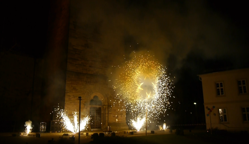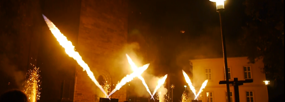 Eine besondere Herausforderung für uns ist jährlich das musiksynchrone Nahbereichsfeuerwerk für das Stadtfest in Steinheim im November. Mit Barockelementen, viel Bühnenpyrotechnik und Flammen, setzen wir den städtischen Vorplatz der Kirche in Szene.